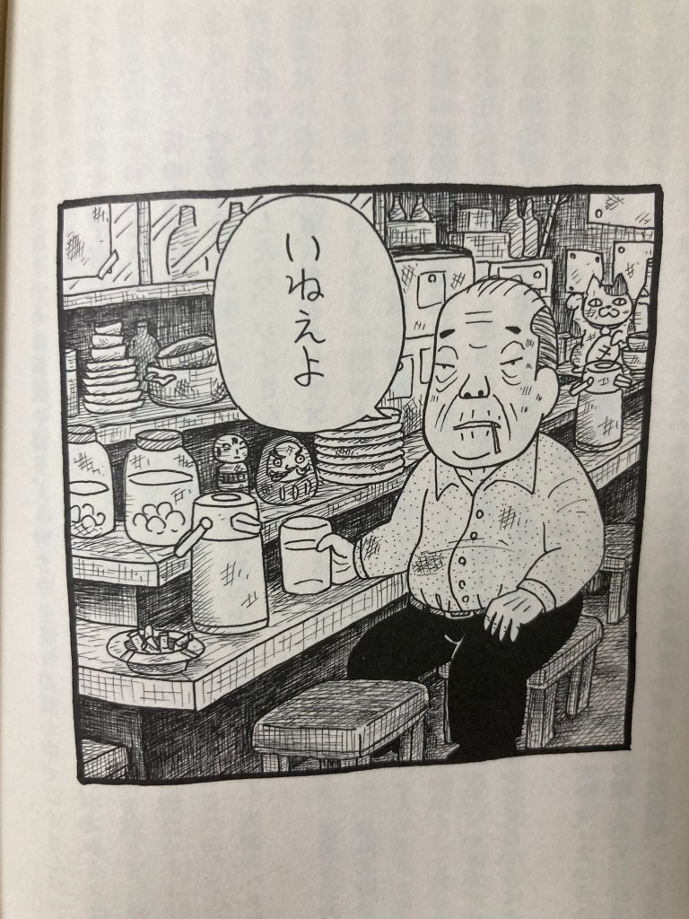 山科氏がとある街で二軒目の店を探していたときの話。昭和感ただよう場末の飲み屋を発見し、ええいと戸を開けると、カウンターの真ん中でジイさんが一人で焼酎のお湯割りのようなものを飲んでいます。ジイさんは山科氏を見て「店主ならいねえよ」と言いました。そのときの挿絵がこちらです。
