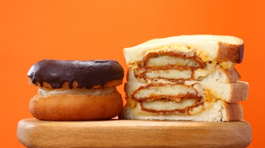 オールドファッションドーナツサンドは1個1055kcal、コロッケたまごサンドは地域で違いがあって、関東1079kcal、中部・近畿1266kcalです。