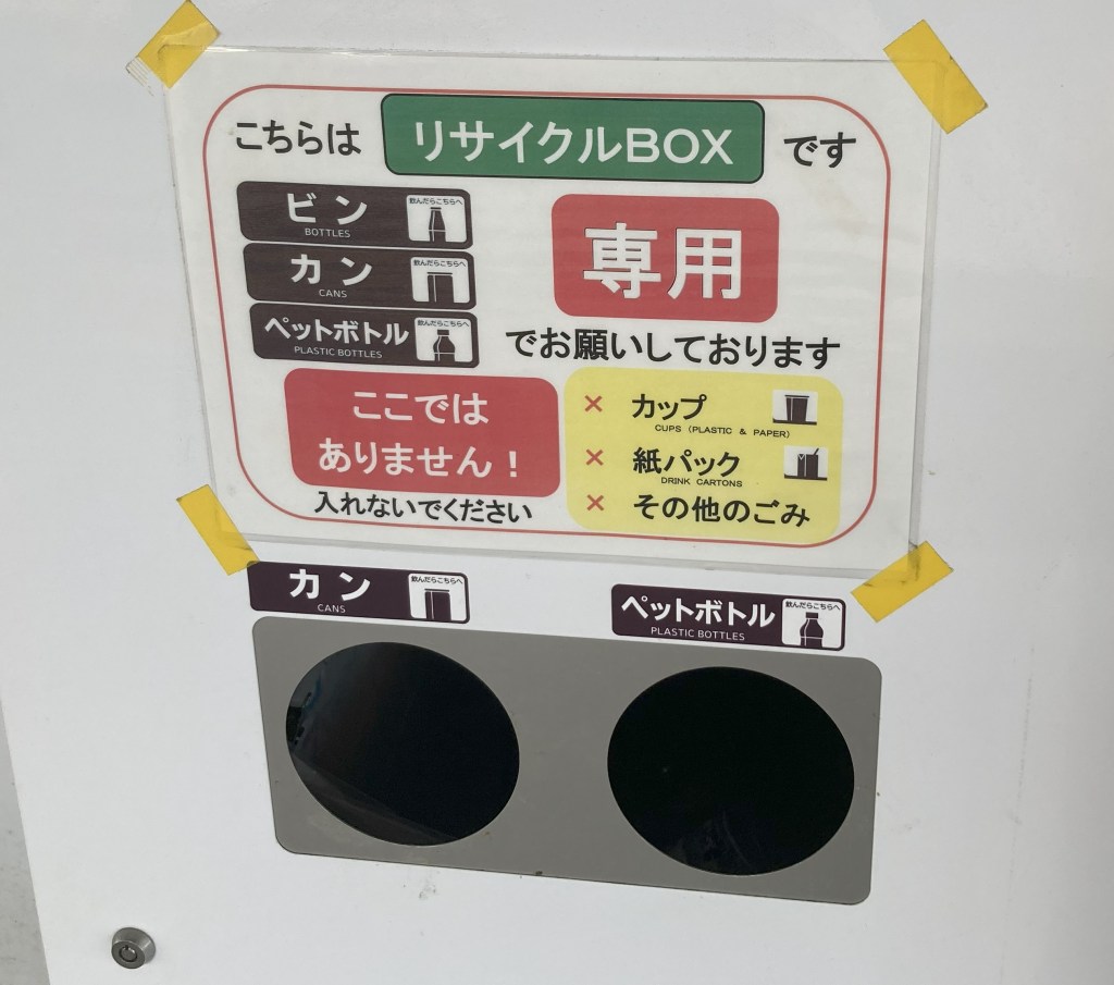 もし私がこの掲示を作り替えるとしたら「ビン、カン、ペットボトル専用のリサイクルボックスです」というメッセージを上部の3分の2くらいのスペースを使って表示します。元の掲示では「専用でお願いしております」となっていますが、そのような遠回しな表現は不要と考えます。