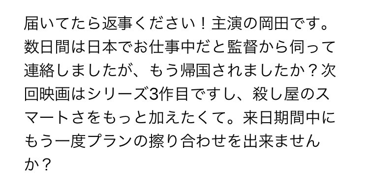こちらは最初のメールが送られた8時間後に送られたものです。送信者の岡田氏が、14時26分に送ったメールが届いているか心配で2回目のメールを送ってきたという設定です。また「主演の岡田です」「次回映画はシリーズ3作目」という内容から、岡田氏の職業が俳優であることがわかりました。シリーズ3作目となる映画の主演ということから、有名俳優であることもわかります。さらに「殺し屋のスマートさ」という内容から、殺し屋役ということもわかります。