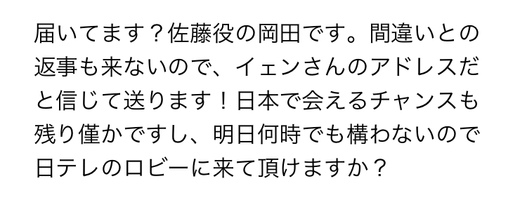 「明日何時でも構わないので、日テレのロビーに来て頂けますか?」って岡田准一は随分時間に余裕があるんですね。香港の俳優であるドニー・イェンになぜ日本語でメールを送っているのかなど、いろいろツッコミたいところはあります。ただ、信じさせるつもりゼロの荒唐無稽な迷惑メールと比べれば、いろいろ工夫してるなと思えます。