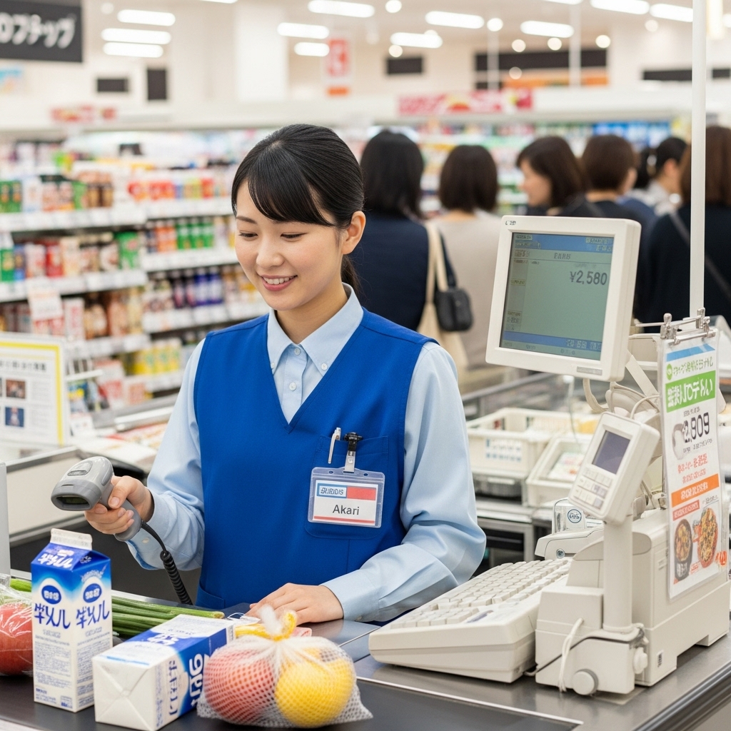 これは「スーパーのレジで働く30歳女性」という指示で生成したものです。現状のAIでは、アルファベットの生成は問題なくできるようです。具体的に指示はしていませんが、AIが気を利かせてレジの女性に「Akari」という名札を付けさせていますね。