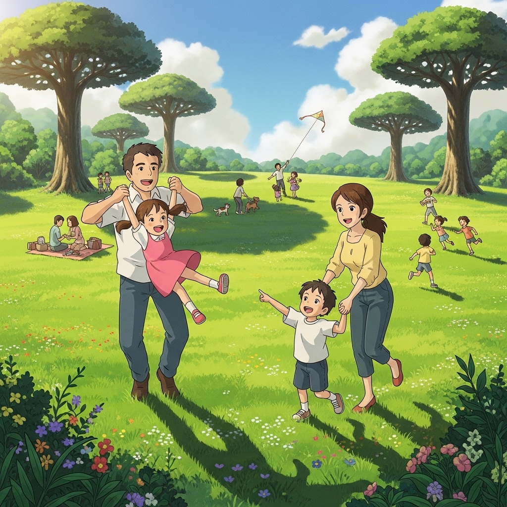 Whiskで「日本人の4人家族(父35歳、母33歳、息子8歳、娘6歳)が公園で遊んでいる。公園では他の人たちも遊んでいる。ジブリアニメ風」と指示したらこんな画像が出てきました。