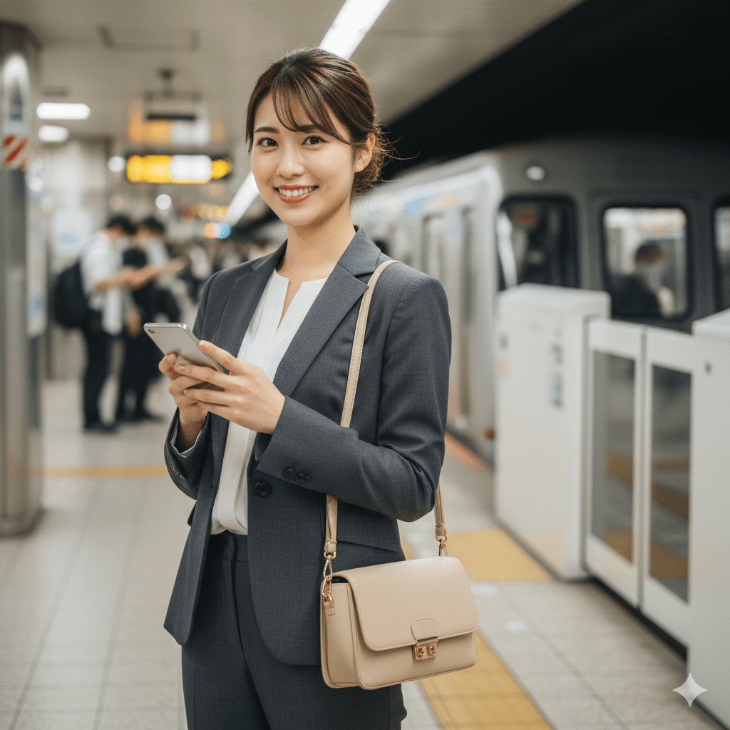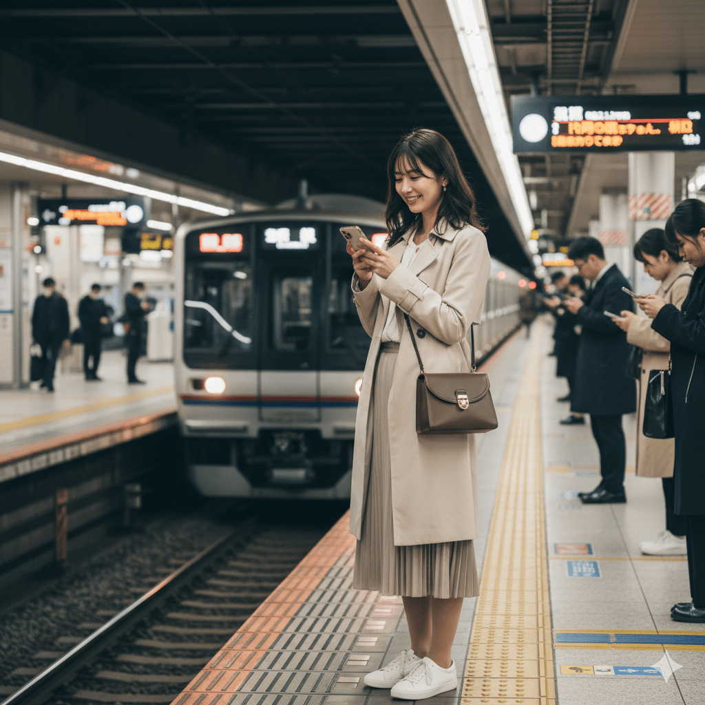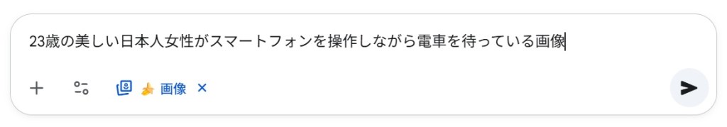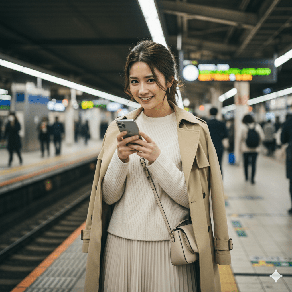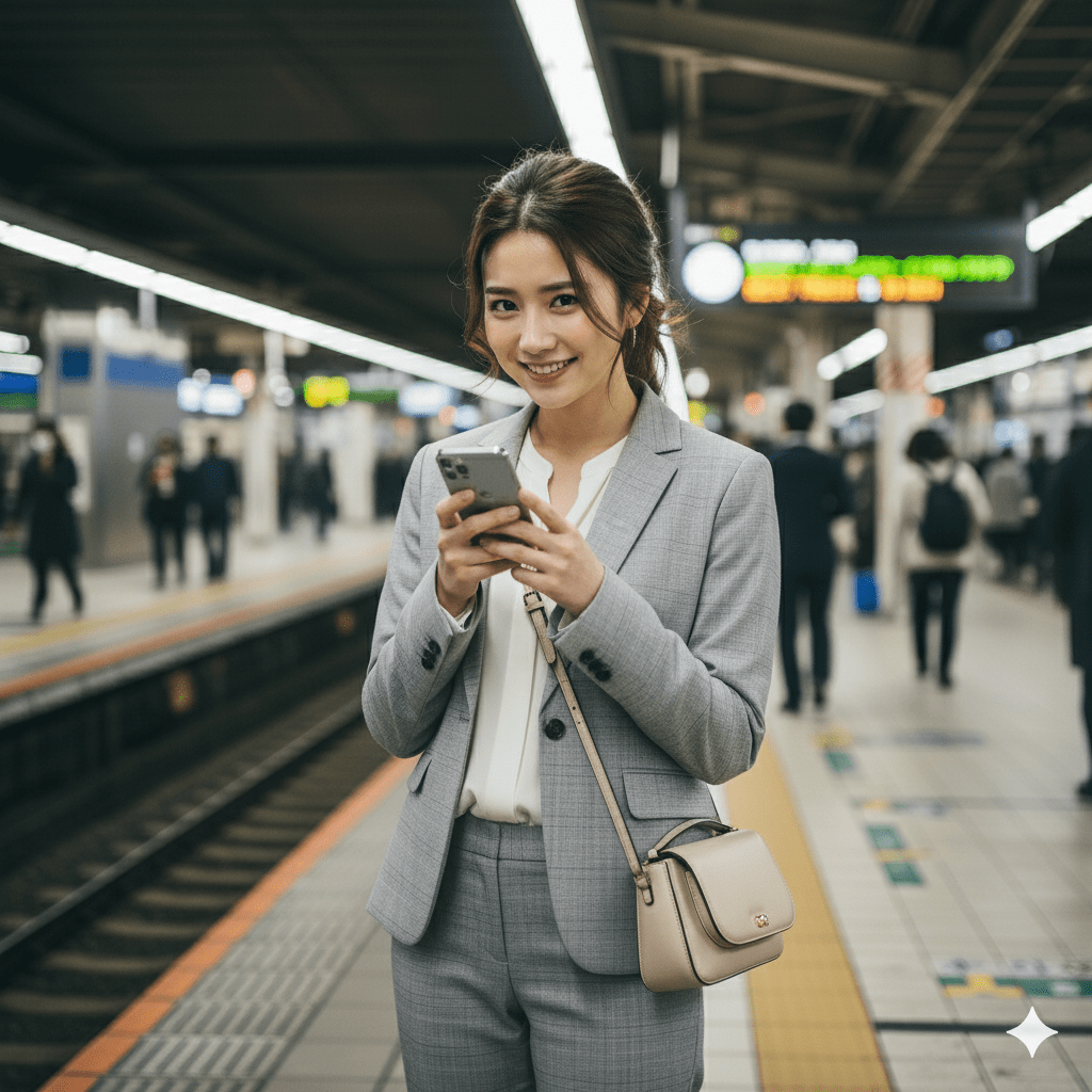 では、画像の修正ではなく、イチから指示してこの画像を再現できるでしょうか。「美しい日本人女性が、スーツを着て電車を待っている。手にはスマートフォンを持っていて、正面を見て微笑んでいる」という指示で画像を生成してみます。