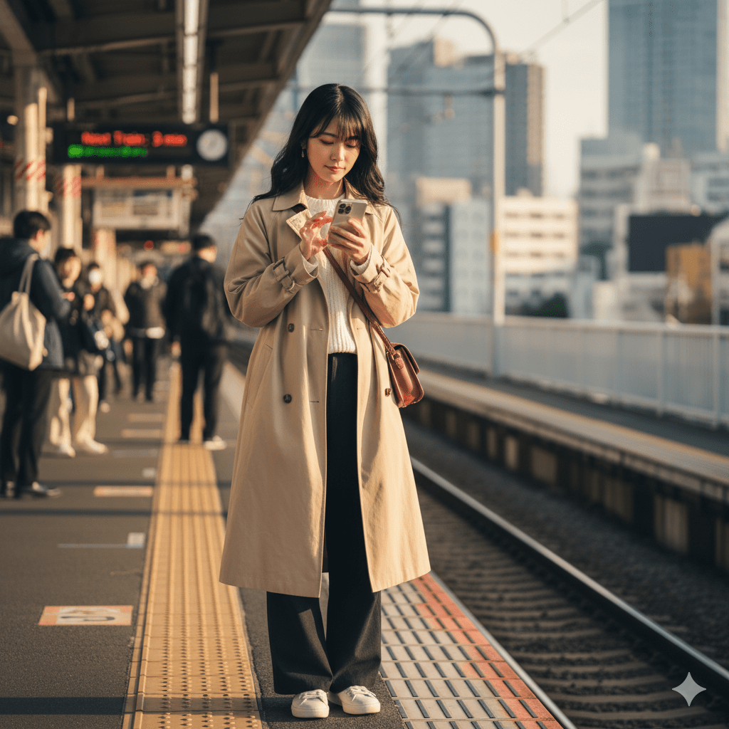外見については「23歳の美しい日本人女性」とだけ指定しています。後はAIが顔、服装、ポーズなどを考えて生成してくれます。1枚目と2枚目は、同一人物に見えます。3枚目は別人ですね。また、この画像を生成した日が10月なので、3枚とも秋の装いになっています。みなさん黄色い線を超えて電車寄りに位置してますね。ちょっと危険です。